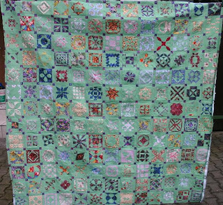 Finally I have patched all blocks of my Flower Jane and sewn them together. One more milestone completed! As I patched all blocks by hand applying the English paper piecing method, I have to take off all the paper now. Crazy and awful work that I don´t like at all. The quilt needs to be finished until November, therefore I will not sew all the triangles as Jane A. Stickle has done in her famous quilt, but I will use plain triangles for the borders.